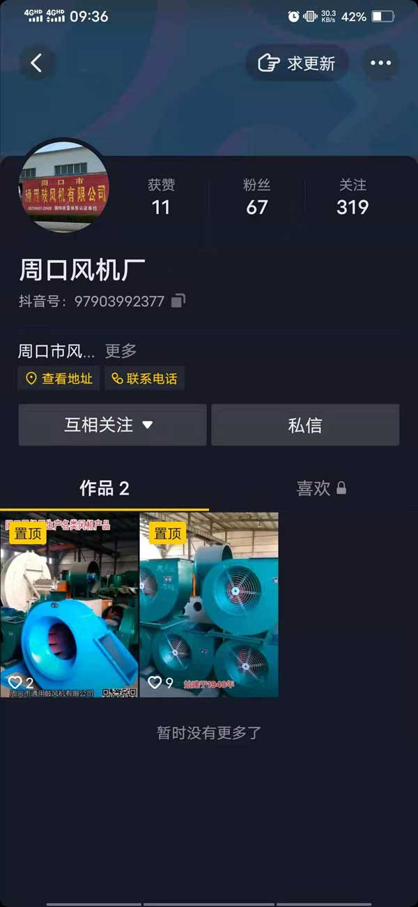抖音名称:周口风机厂,抖音号为:97903992377